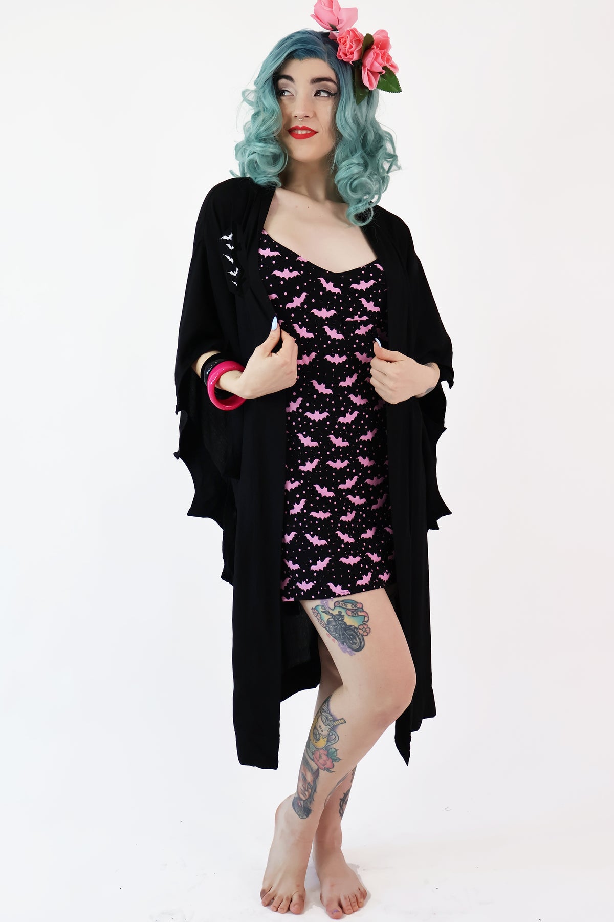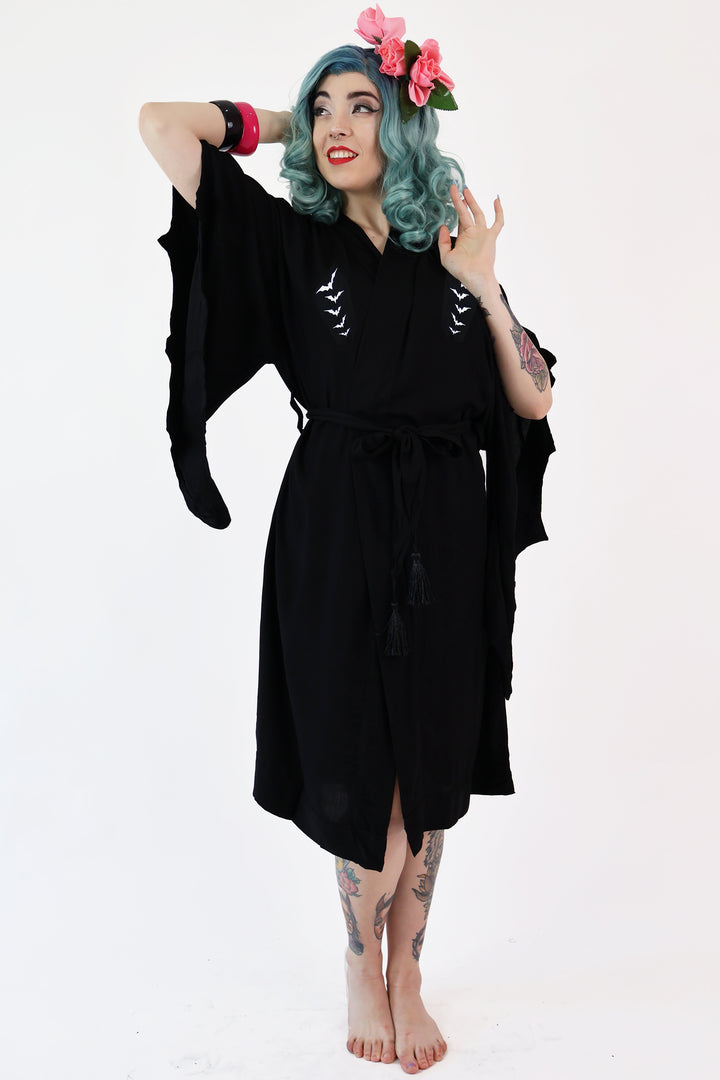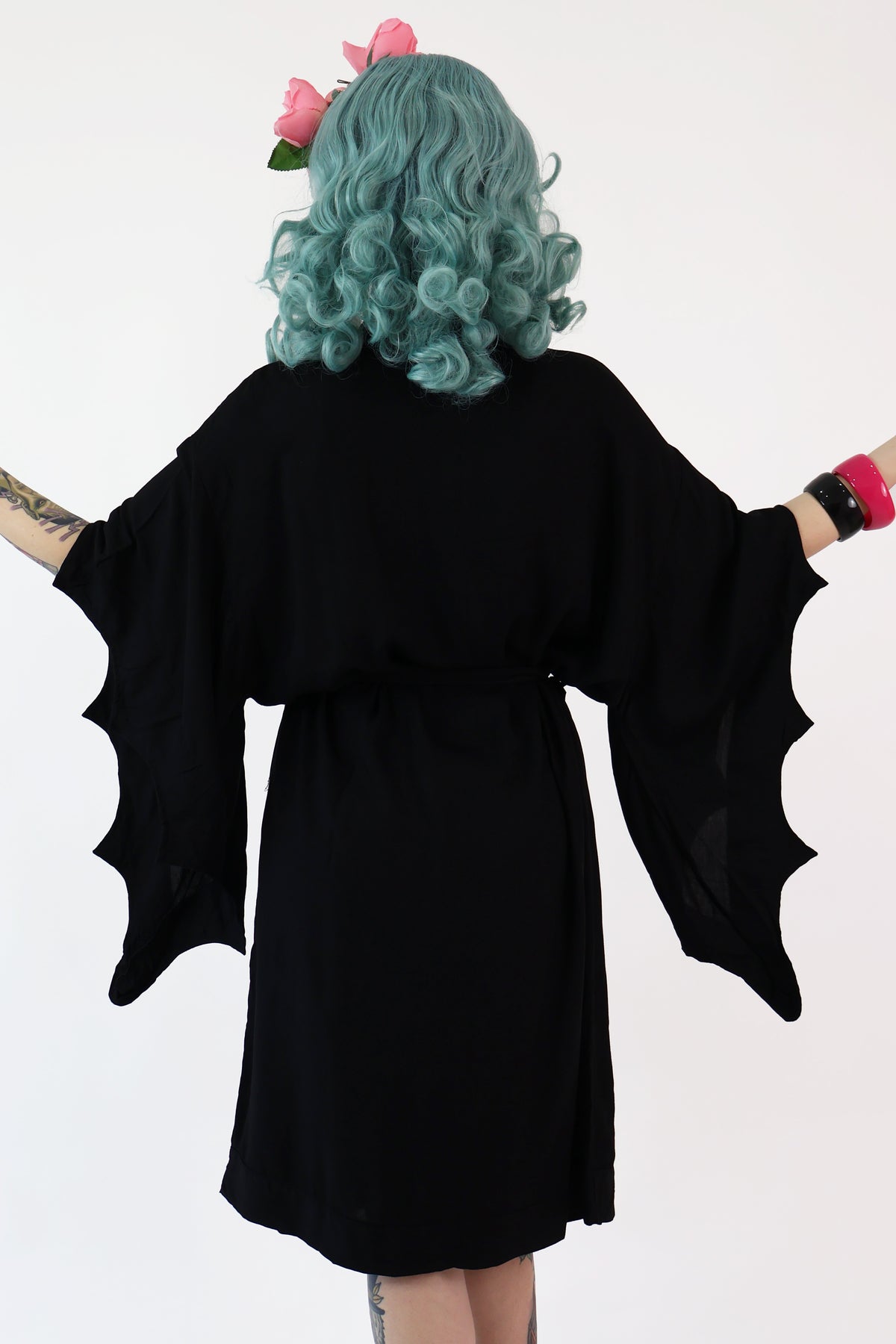 This dark and elegant vintage styled gown will see you living to lounge. It's perfect for lazy days or getting frocked up for a night out. Featuring stunning, flared scalloped sleeves, &  embroidered front, bat detail, it has a black belt with lovely tassel tie.