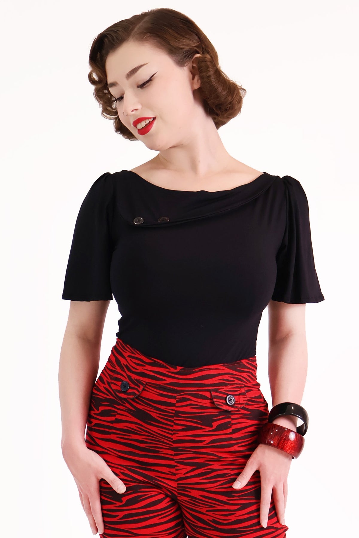 This fabulous, pin up styled top features a classic high neck, with fold down collar and double button detail.