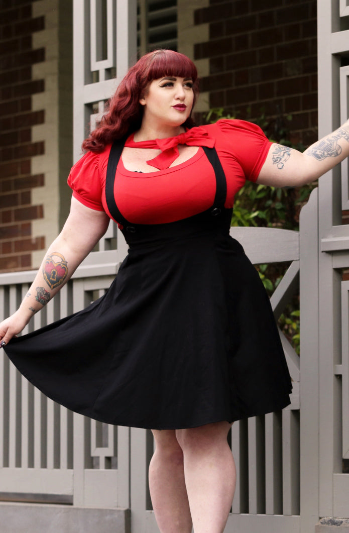 The straps cross over at the back and are fully adjustable. It has two front buttons, deep front pockets and a back zip for easy wear. The waist is designed to nip you in, while the full swing skirt creates a lovely feminine silhouette and sits approximately 15cm above the knee. Skirt measures approx 56cm.