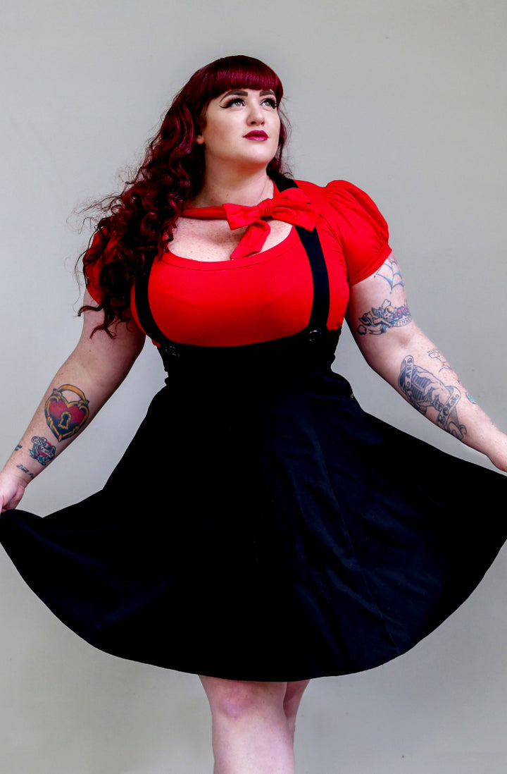Get back to basics with this short and sweet skater pinafore. This flirty and fun, pinafore features a shorter style, 3/4 circle skirt. Easy to wear its perfect to dress up or down.