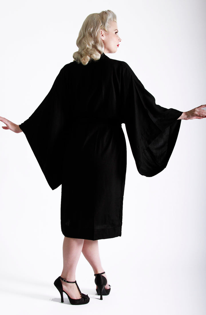 This dark and elegant vintage styled gown will see you living to lounge. Featuring stunning, flared sleeves, gorgeous embroidered spiderweb detail and a black belt with lovely tassel tie.